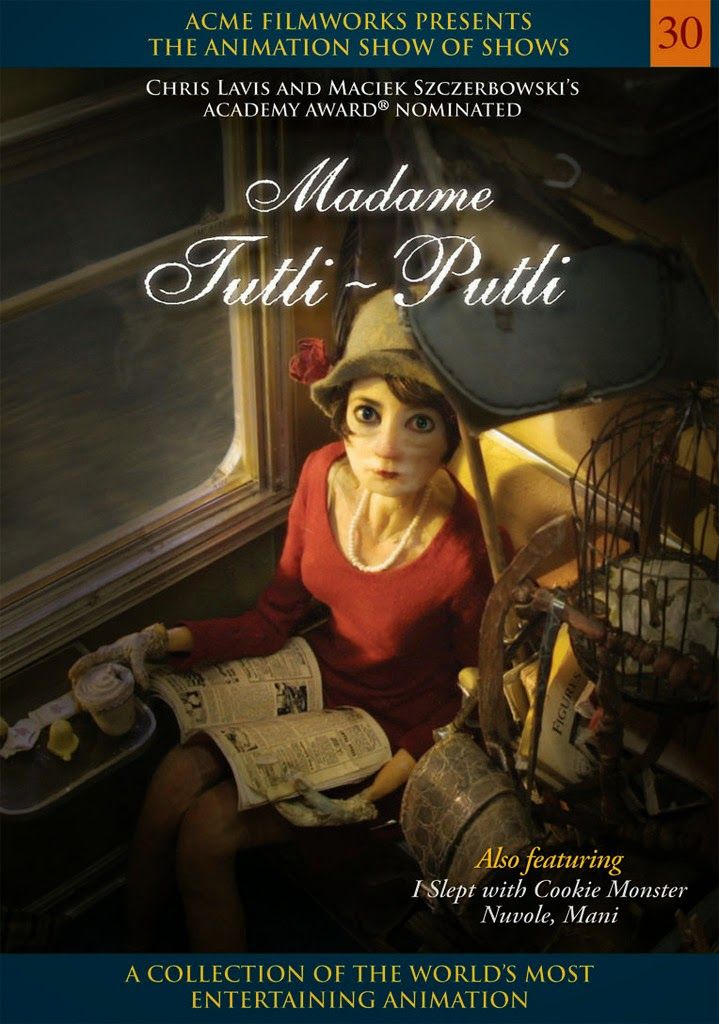 Madame Tutli-Putli (2007) : Yönetmenler; Chris Lavis, Maciek Szczerbowski bu animeyi yazıp yaratmışlar. 2007 tarihli Kanada yapımı Clyde Henry Productions olarak bilinen ve Kanada Ulusal Film Kurulu (National Film Board of Canada) Montreal stüdyolarında üretilmiştir. Stop motion animasyonlu kısa filmidir. Cinema16: World Short Films yayınıdır. 17 dakika sürer. Yukarıda yayınlanan videoda full izleyebilirsin.