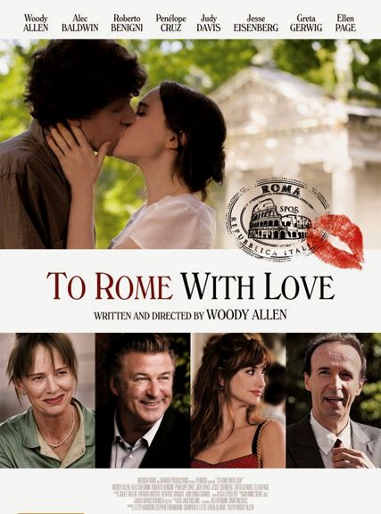 To Rome With Love (2012) : Woody Allen‘ın yazıp yönettiği ve hatta oyuncu kadrosunda yer aldığı film, Roma’da geçen dört farklı öyküyü konu alır. Romantik komedi ve müzik kategorindedir. 77 yaşında ve büyük bir sansasyon ile uğraşan yönetmenin son filmi olma özelliğini taşır. Amerika, İspanya ve İtalya ortak yapımıdır. Diğer oyuncular Penélope Cruz, Jesse Eisenberg. Film 112 dakika sürer. Türkçe’ ye “Roma’ya Sevgiler 2012” olarak çevrilmiştir. Eserin 2 galibiyet, 5 adaylık ödülü de mevcuttur.