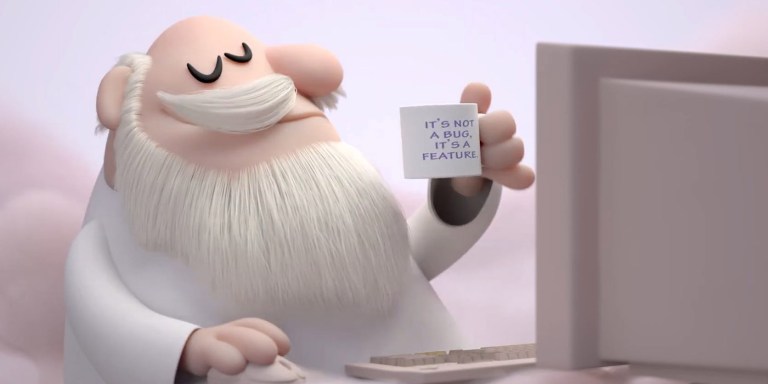 Tanrı, tek ebeveynli ve amatör bir programcı olarak karşımıza çıkıyor. ‘Dünya‘ projesi üzerinde çalışıyor ama çocuklardan bir türlü konsantre olamıyor gibi görünüyor. Yine de bir gün, sonunda bir atılım yapıp mavi gezegeni yaratırken…